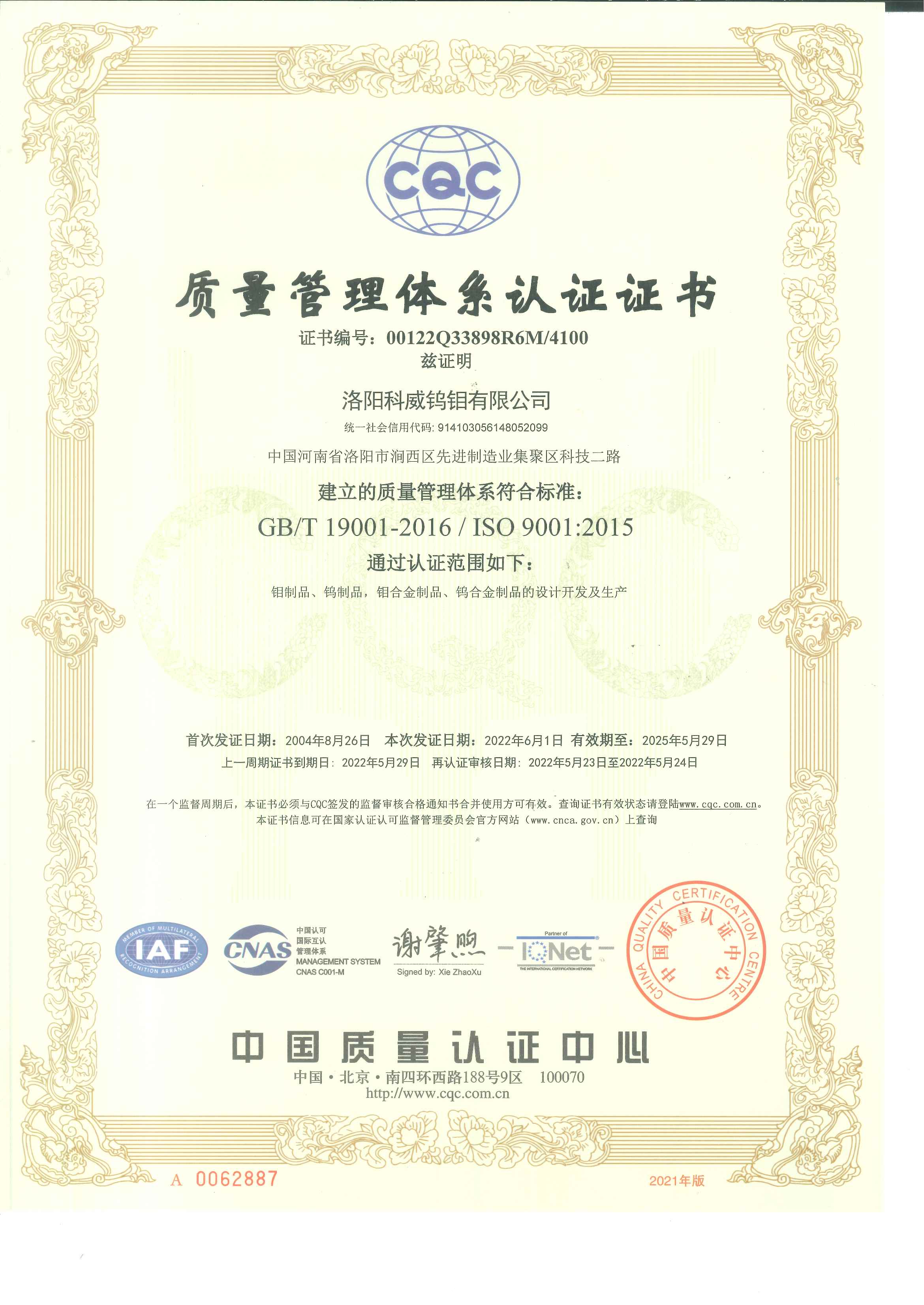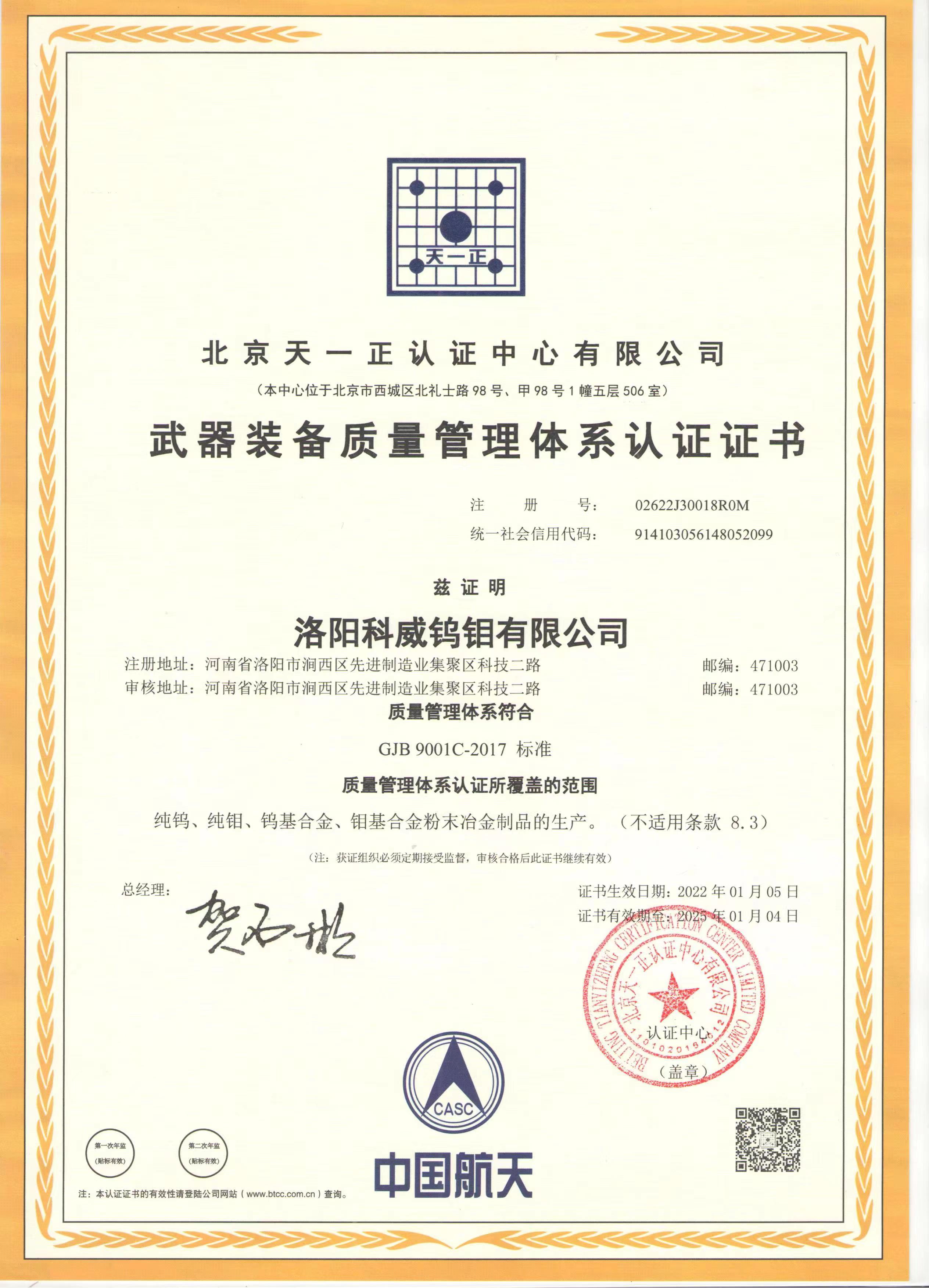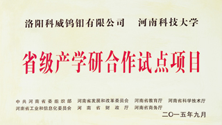 四、荣誉: “国家高新技术企业”, 国家专精特新重点“小巨人”企业, “国家科技型中小型企业”, “河南省钼及钼合金工程技术研究中心”, “有色金属省部共建协创中心理事单位”,“2025年河南省首批次新材料产品”,等。